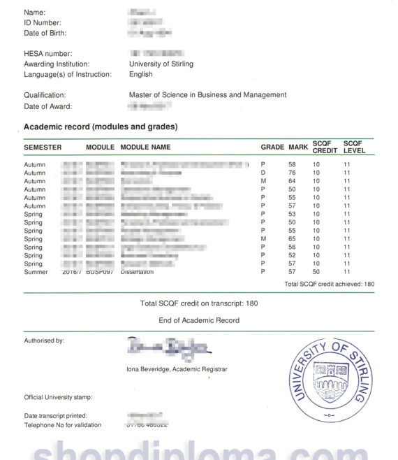 university of Stirling official transcript of academic performance